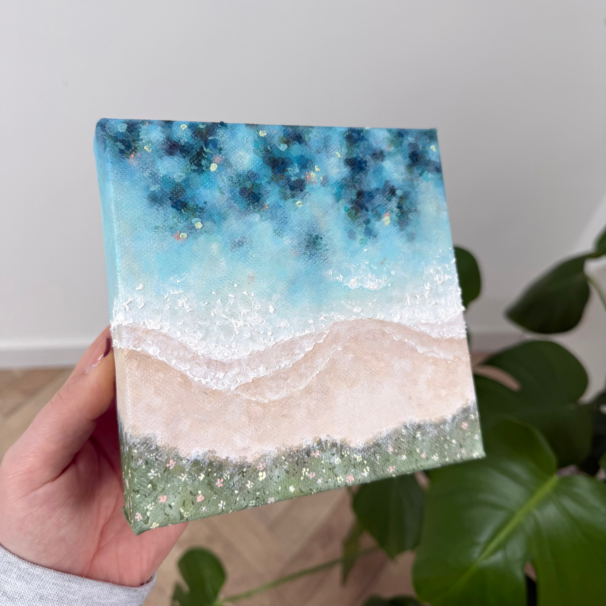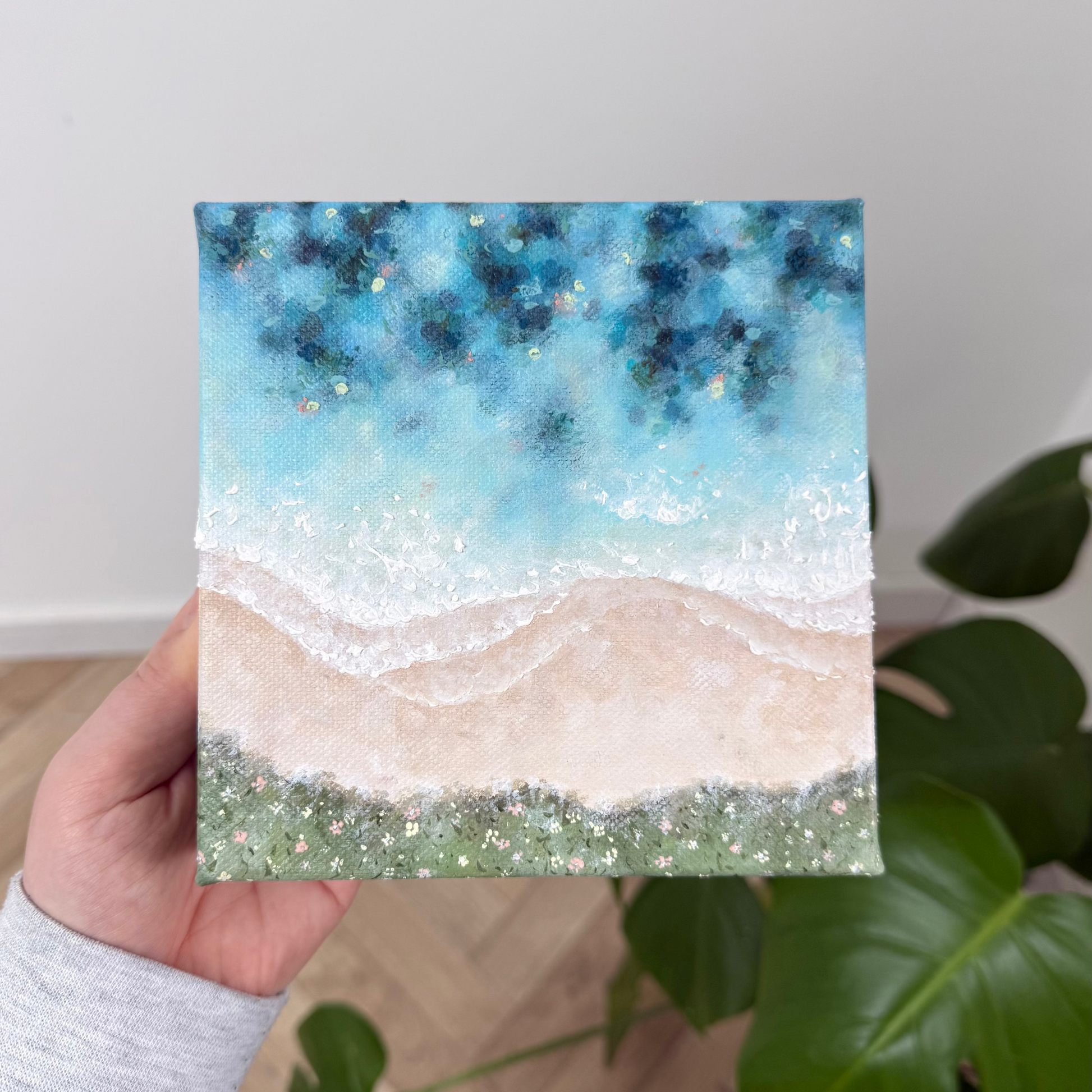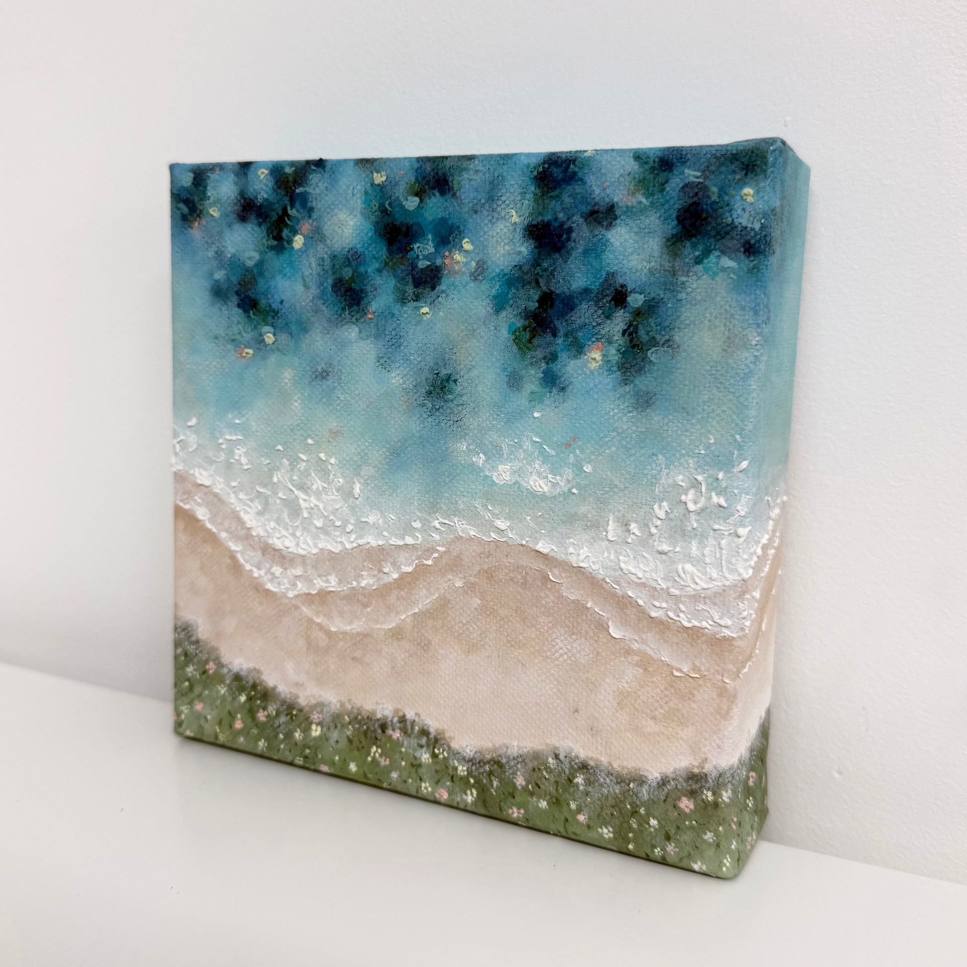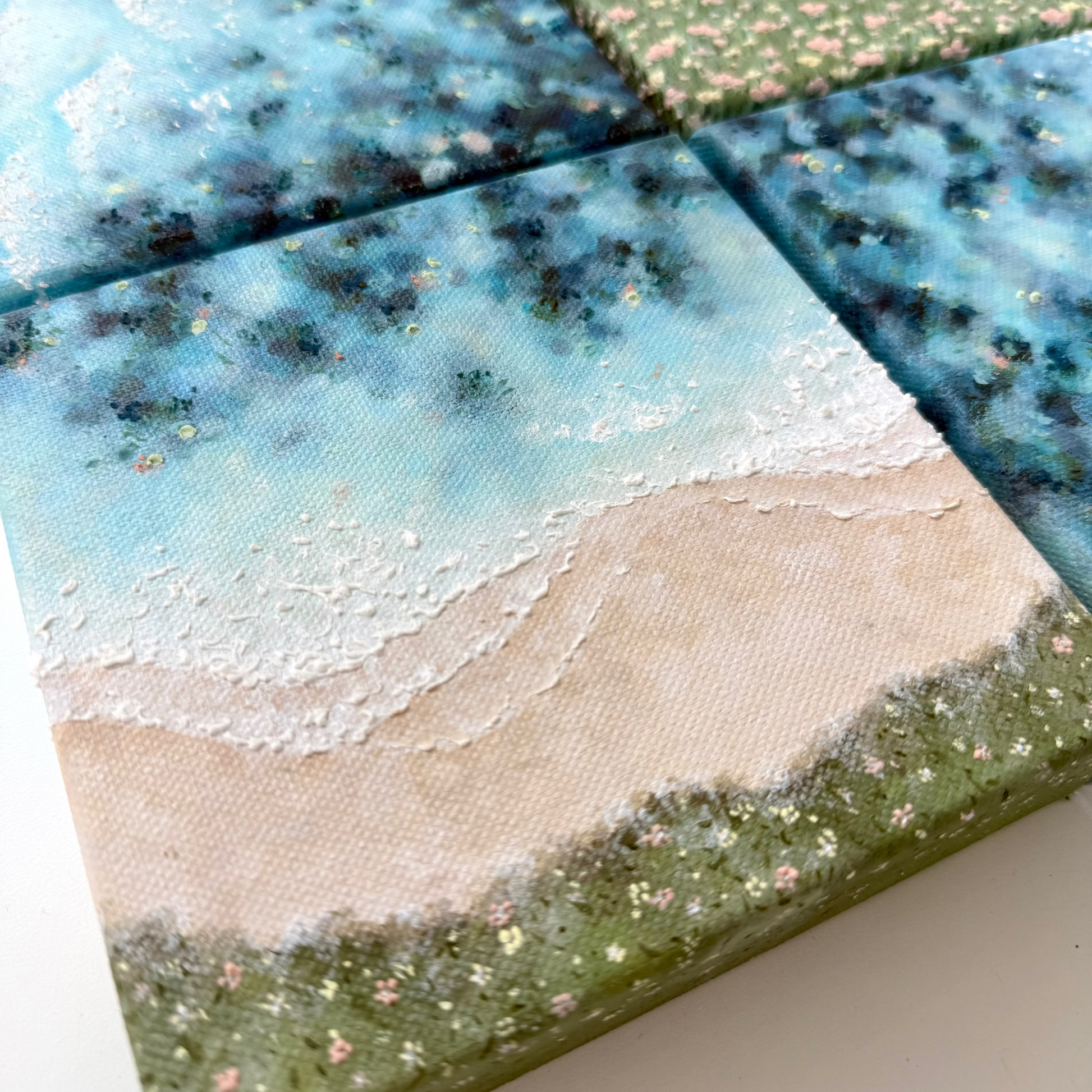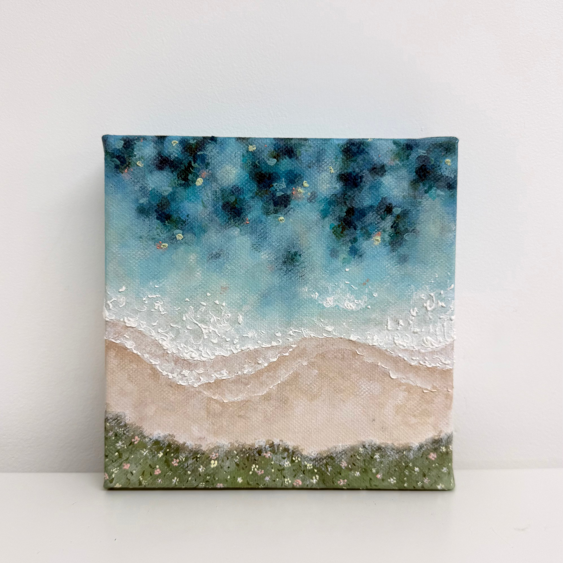 With this piece, I wanted to bring in soft coastal florals to frame the scene while keeping the focus on the sea itself, full of shifting colour and texture. Up close, you can spot gentle hints of pink and yellow woven through the water, creating a warm, sunlit atmosphere and connecting with the colours of the land and florals.