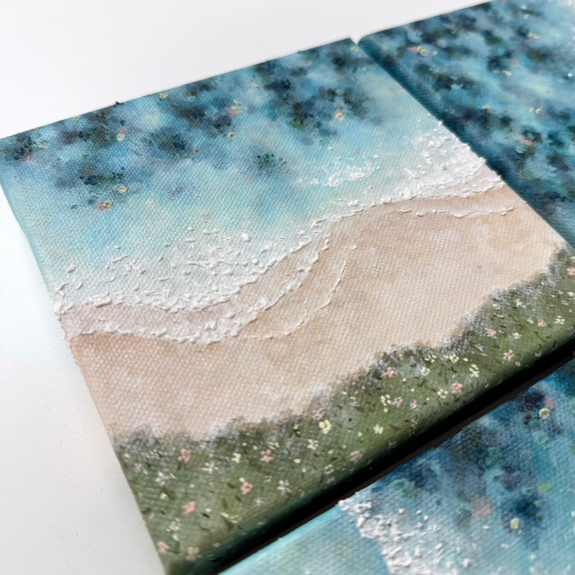 This mini series began as a way to reconnect with creativity after spending time on commissions. I wanted to paint purely for the joy of it, no plans, no reference photos, just creating from memory and imagination. Each piece is inspired by Cornwall, the colours of the coast, and the textures of sand, rock, and sea.