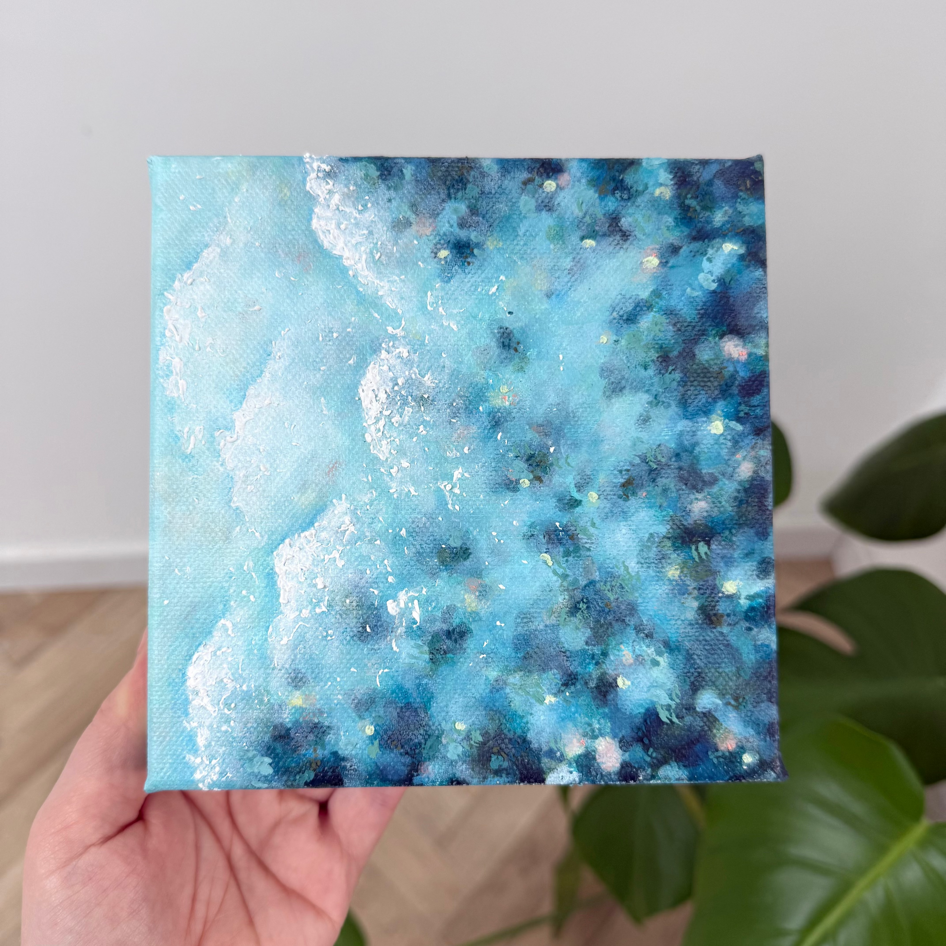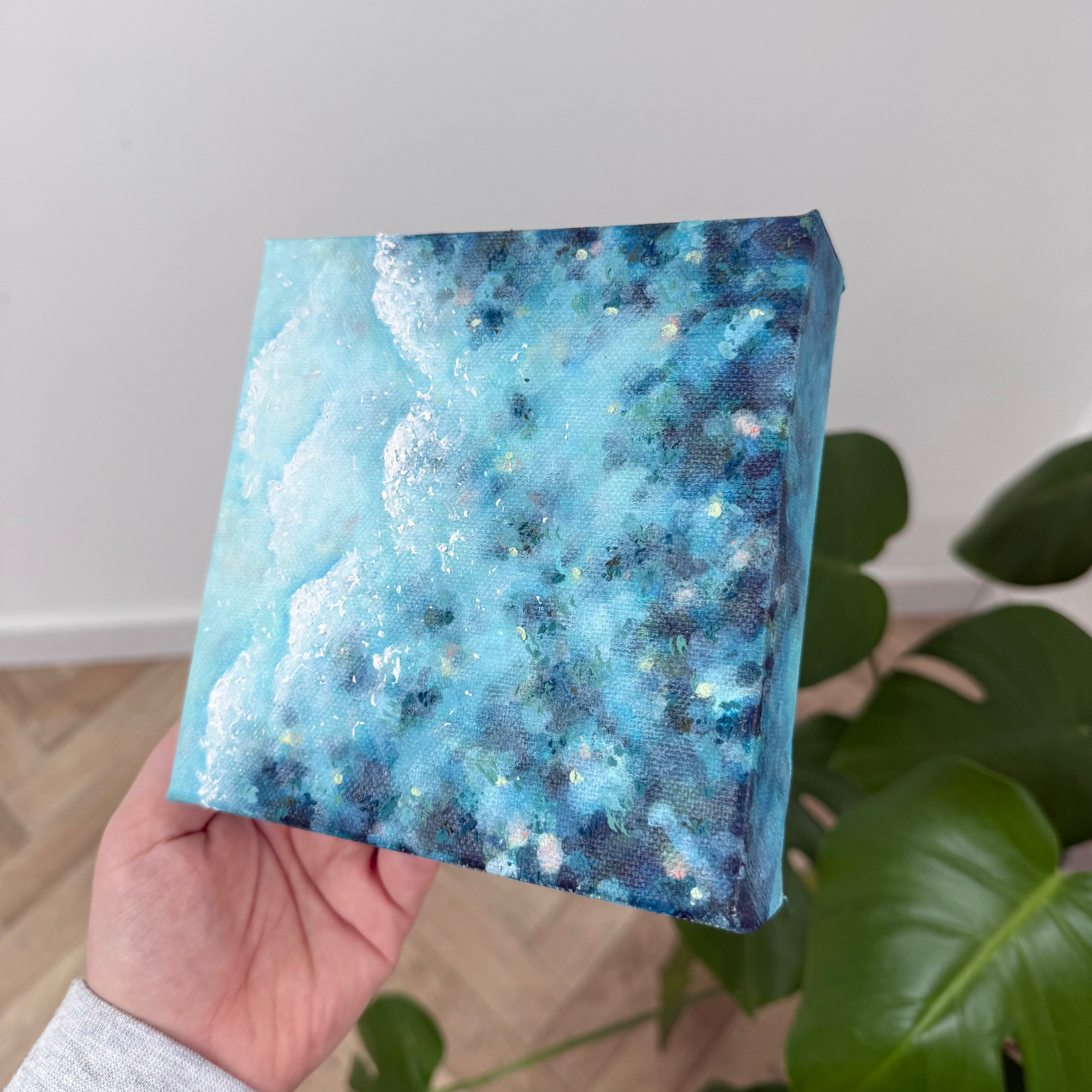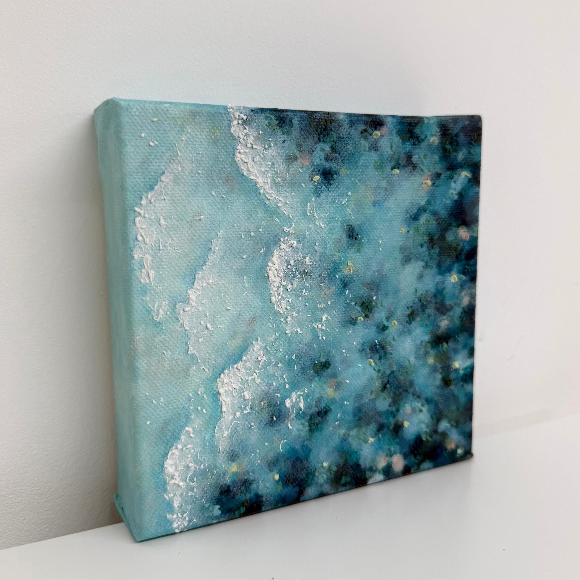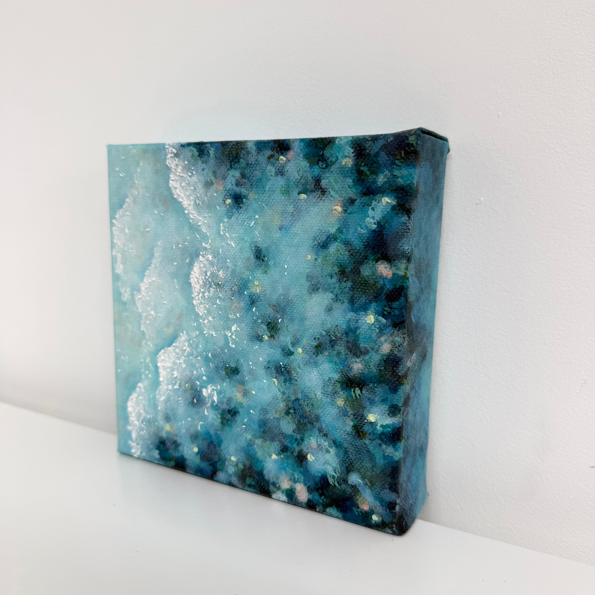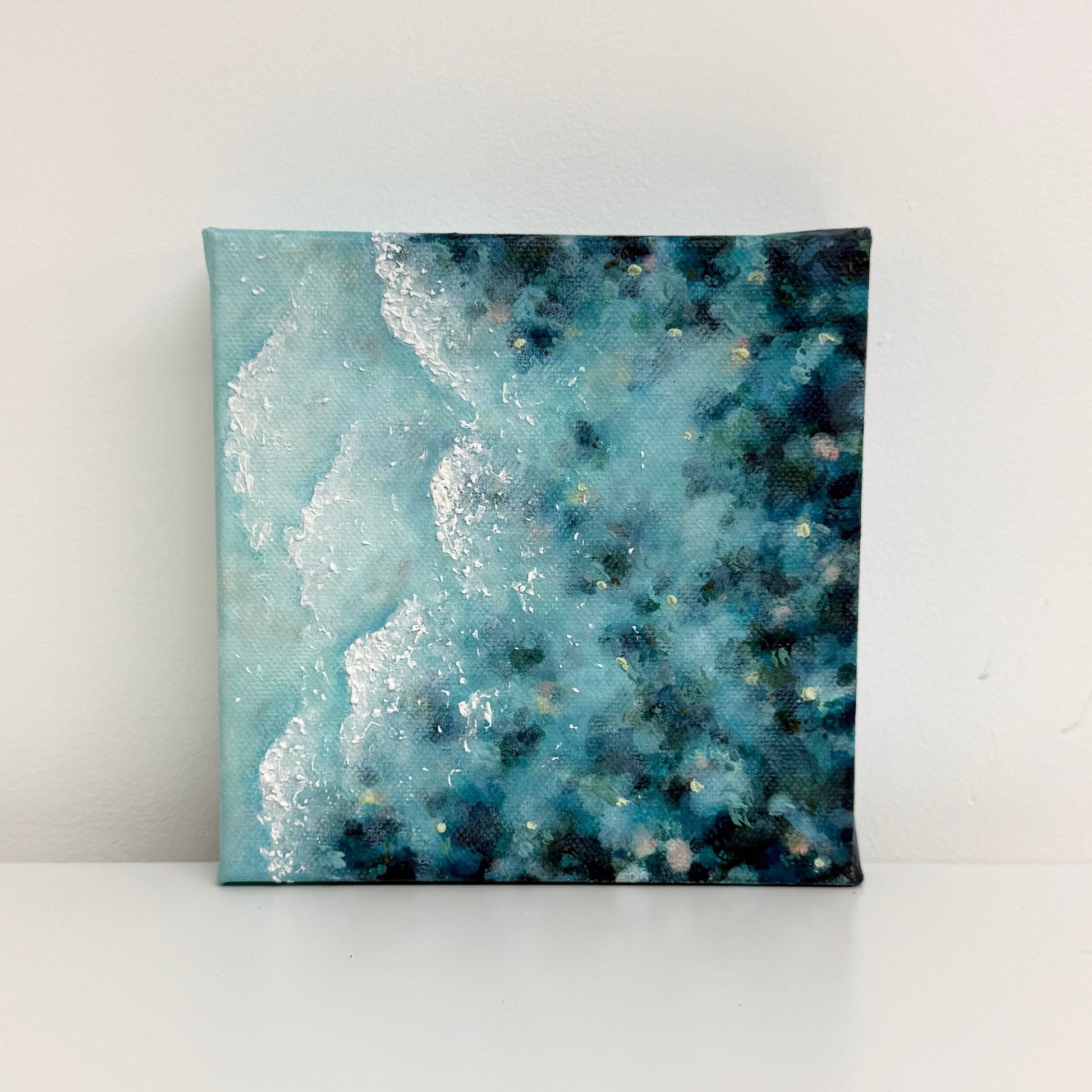 This piece was inspired by a larger painting I’m currently working on. I couldn’t resist creating a mini version for this collection! I loved exploring the depth and movement in the water, and focussing on the waves, their movement, texture, and the feeling of calm energy they bring.