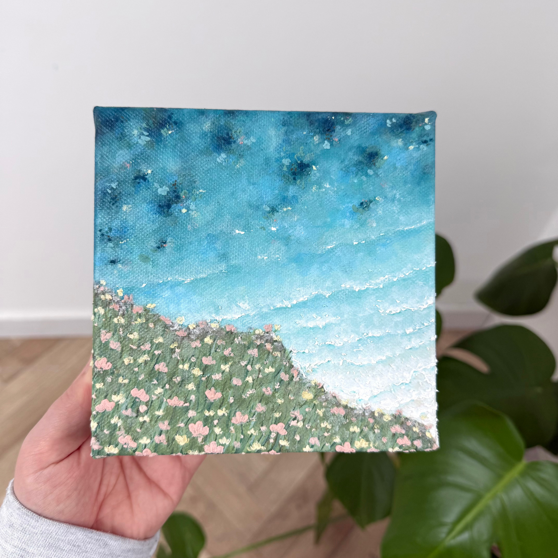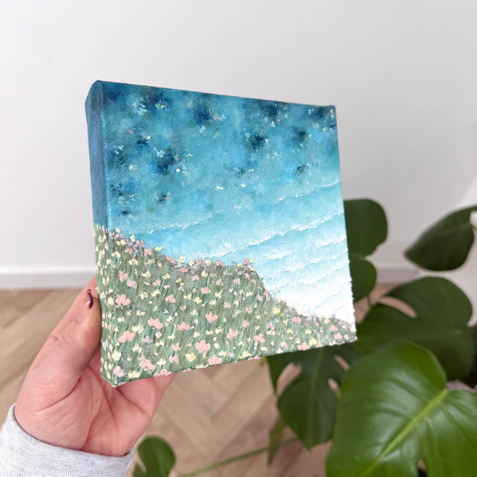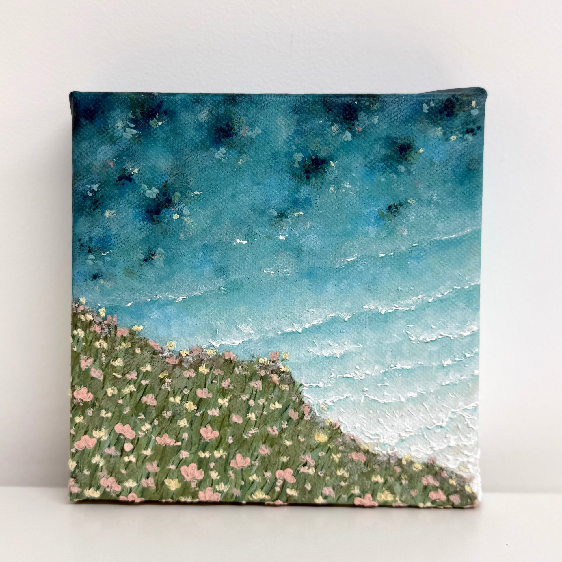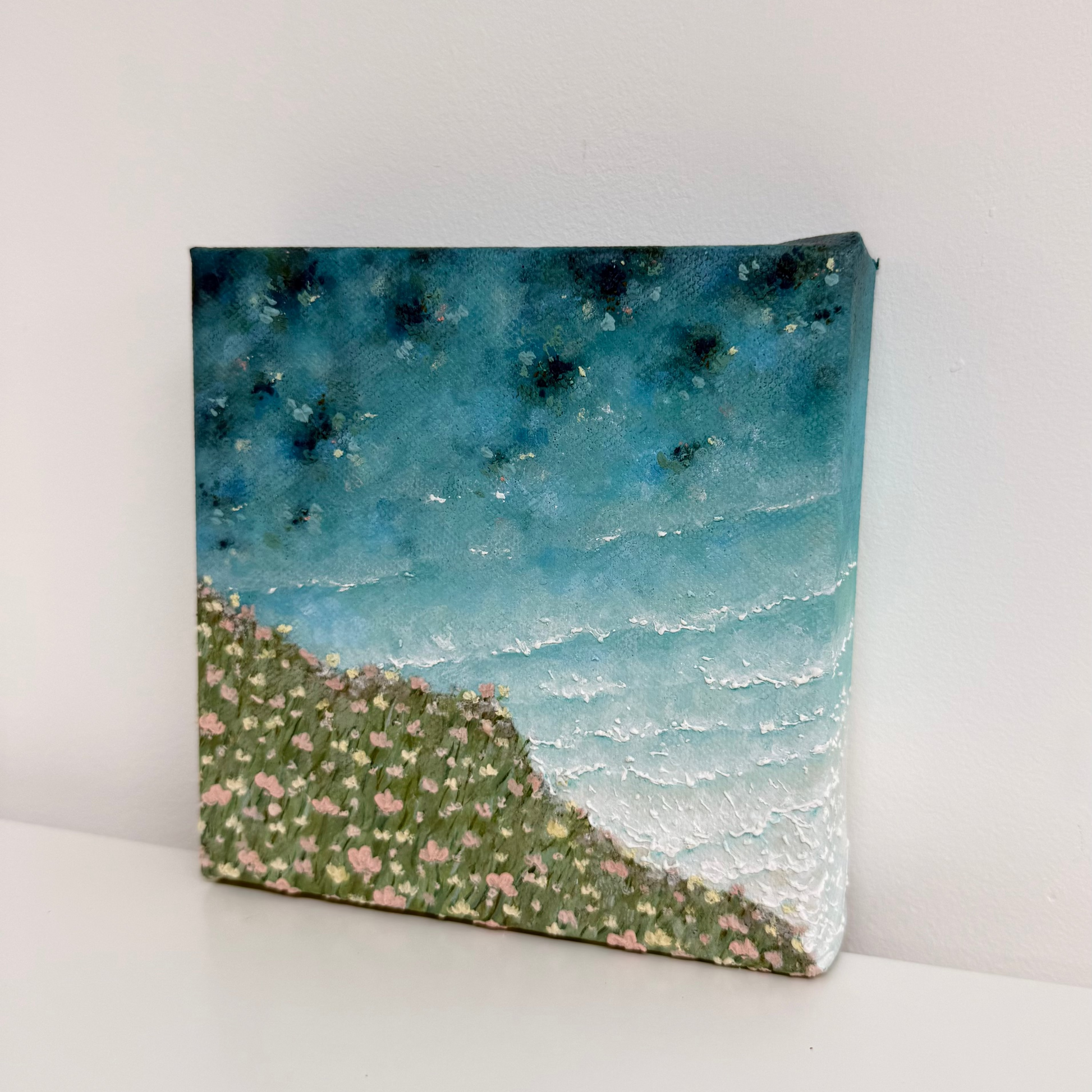 This piece was inspired by a photo I took from the cliffs at Bedruthan Steps in Cornwall. Standing on the edge, looking down at the water below, was such a peaceful moment. I wanted to capture that feeling in paint. The textured flowers in the foreground bring a touch of softness and contrast to the rugged coastline.