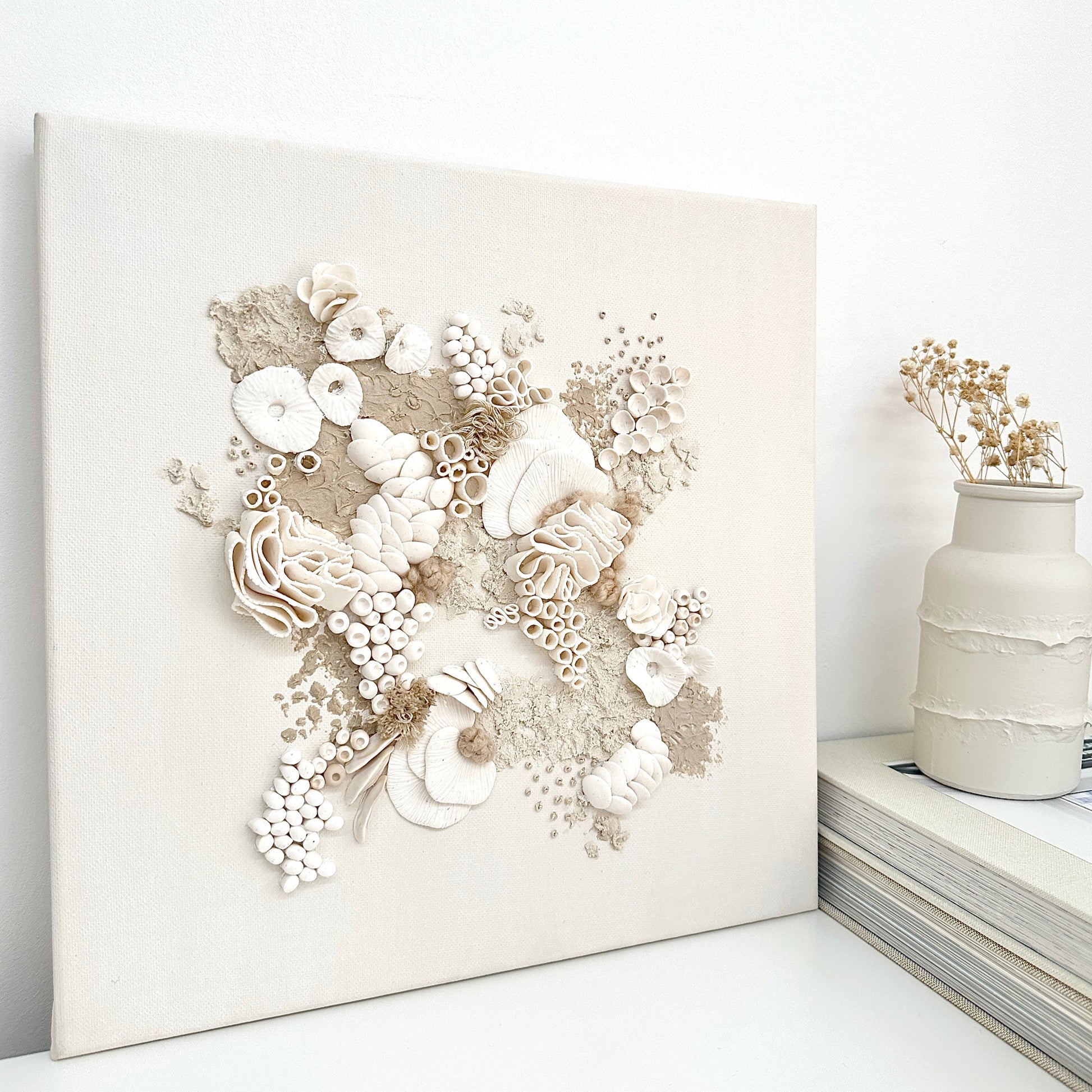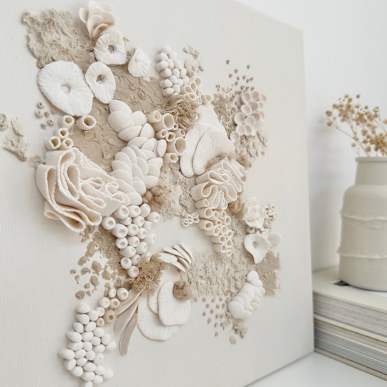 This piece is crafted with attention to detail, the clay elements of the artwork intricately replicate the delicate structures of a coral reef. Each texture and pattern is sculpted, bringing the underwater world to life on the canvas. Delicate stitches weave through the composition, mimicking the graceful movements of underwater currents.