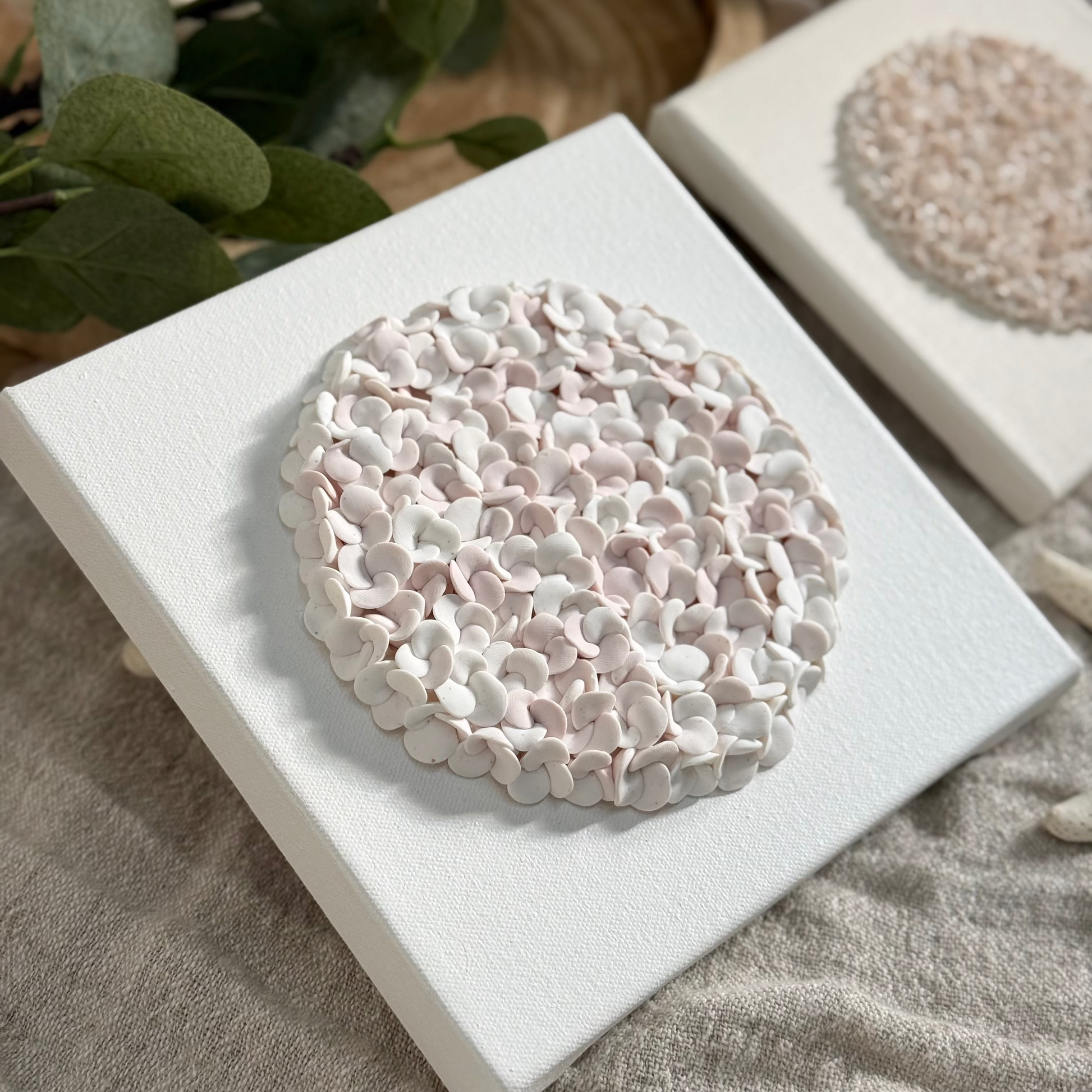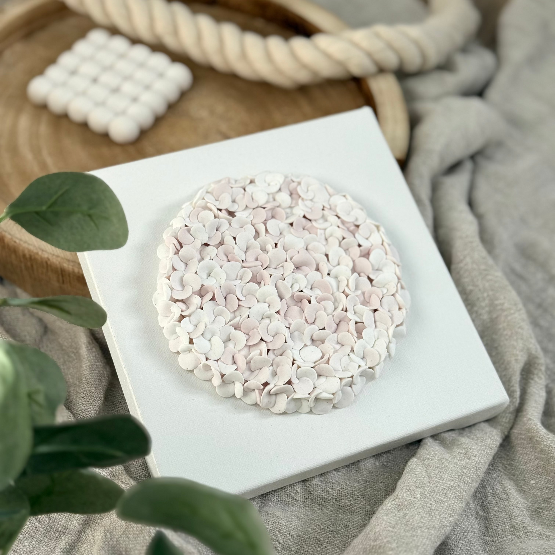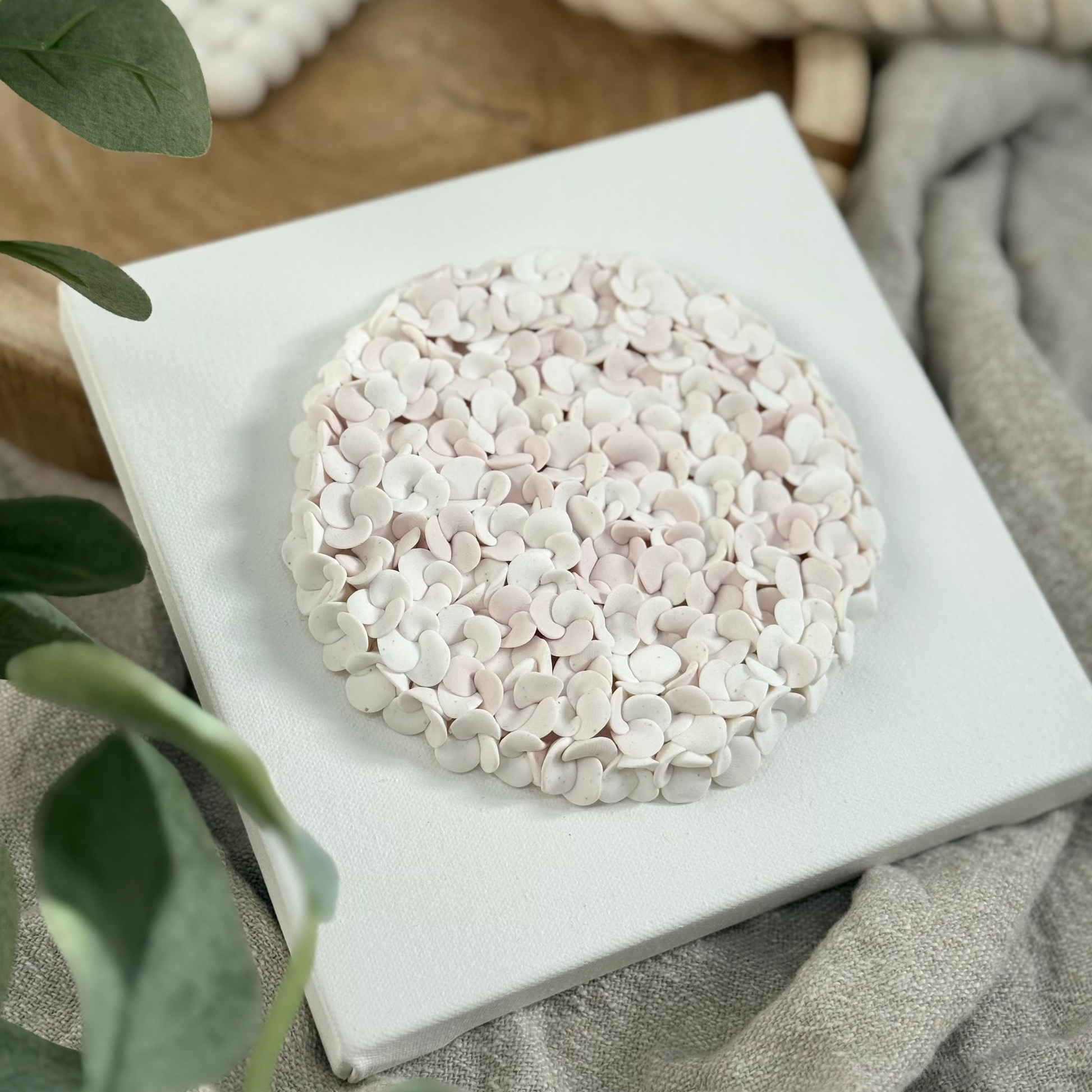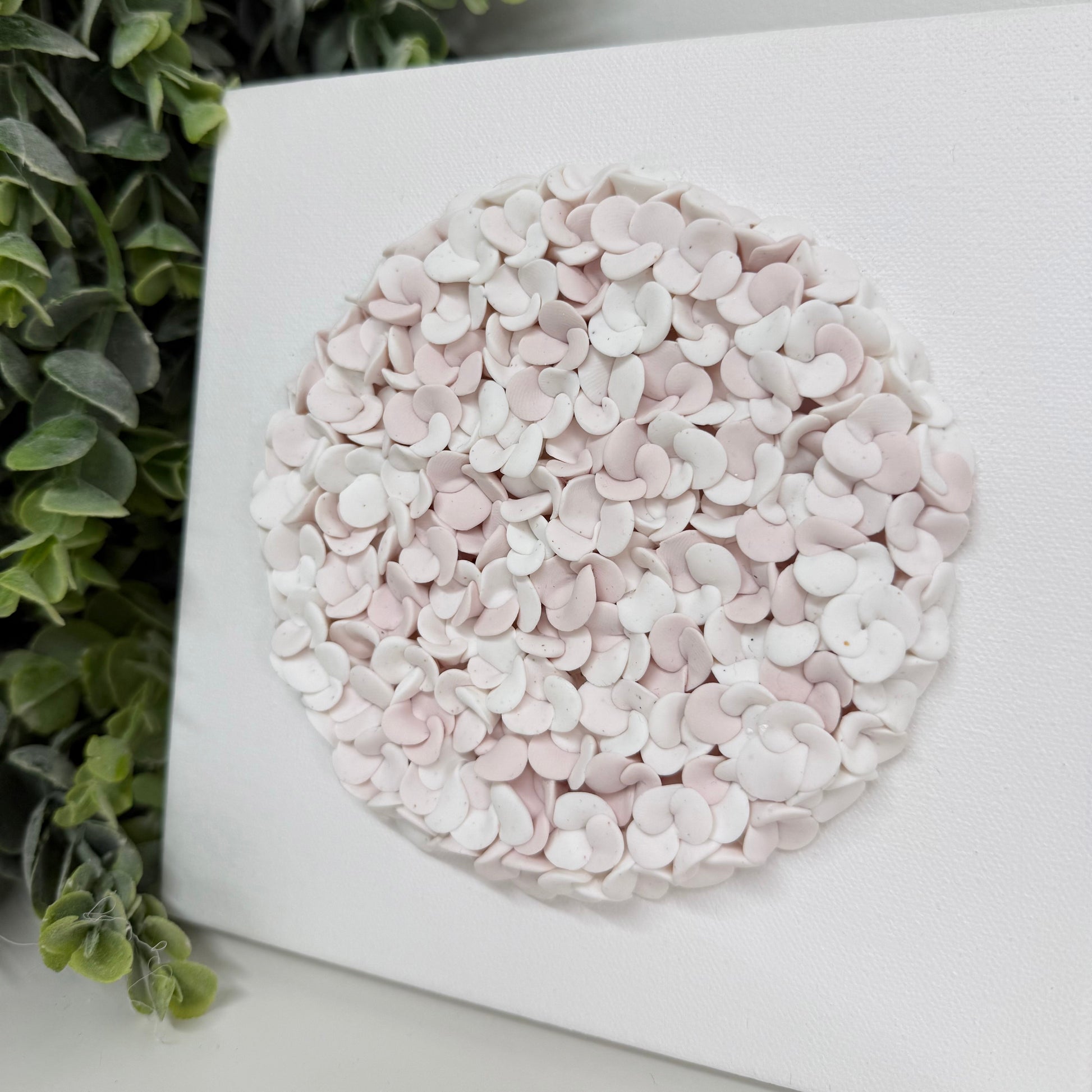 This hydrangea inspired textured floral artwork is a handmade 3D clay flower canvas designed to bring soft texture and warmth to your home.